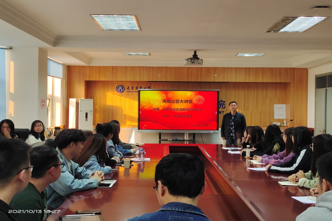韩海彬副教授从“正确认识学术研究”话题入手,先对学术研究是什么做了解释。随后,对研究生选题阶段会面临到的“如何选择研究题目?”“选题如何从文献中来?”“如何撰写高质量论文?”等问题逐一进行了分析及解答,并结合自己的论文指导经验总结出数十条学位论文选题和撰写过程中普遍存在的问题与同学们进行了重点分享。