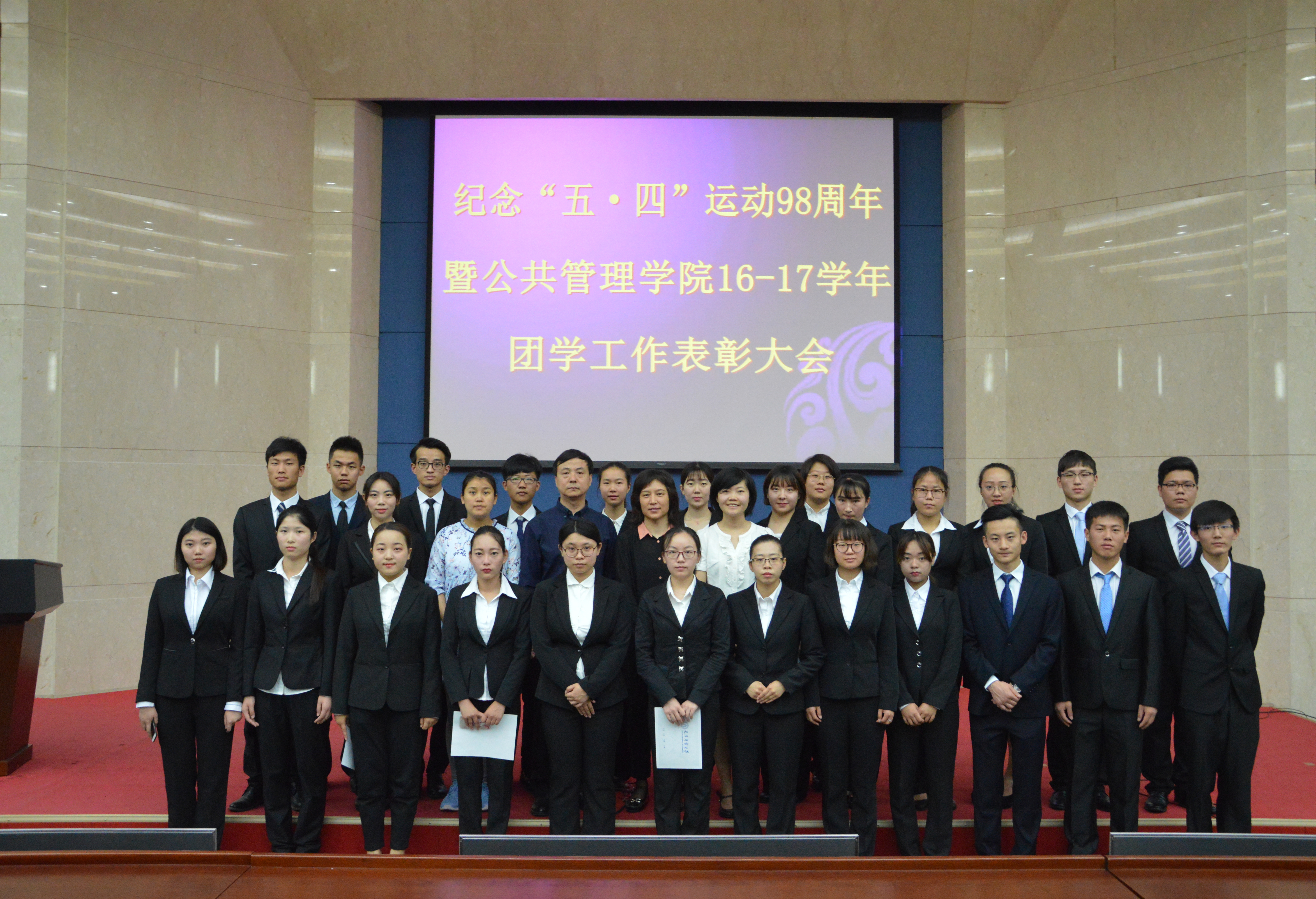 为弘扬“五·四”精神,表彰先进,树立典型,5月12日上午,bevictor1946韦德官网纪念“五·四”运动98周年暨2016-2017学年度团学工作表彰大会在图书馆学术报告厅召开。公共管理公司党委书记白洪文、党委副书记刘均玲、辅导员孙瑶、仉雅琼出席会议,获奖代表、员工干部和2016级员工代表参加会议。会议由辅导员沈洁主持。